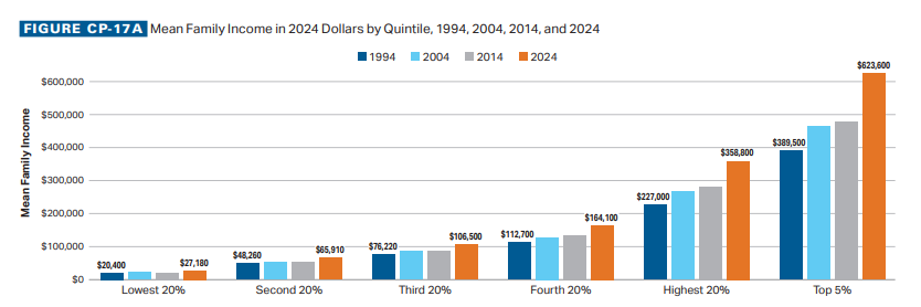 This drop in net income must be attributed to factors beyond spending power, as average income increased by 58% for the top quintile of families and by 33% for the lowest quintile of families, after adjusting for inflation: