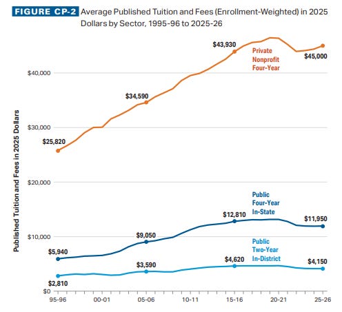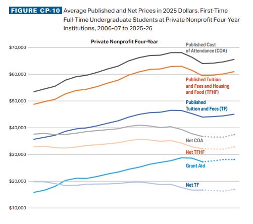 Despite the rising graph, net prices (what students actually pay after scholarships and grants) seem to be stable or declining. According to the report, the average net tuition and fees paid by first-time full-time students enrolled in private nonprofit four-year institutions declined from $19,810 (in 2025 dollars) in 2006-07 to an estimated $16,910 in 2025-26.