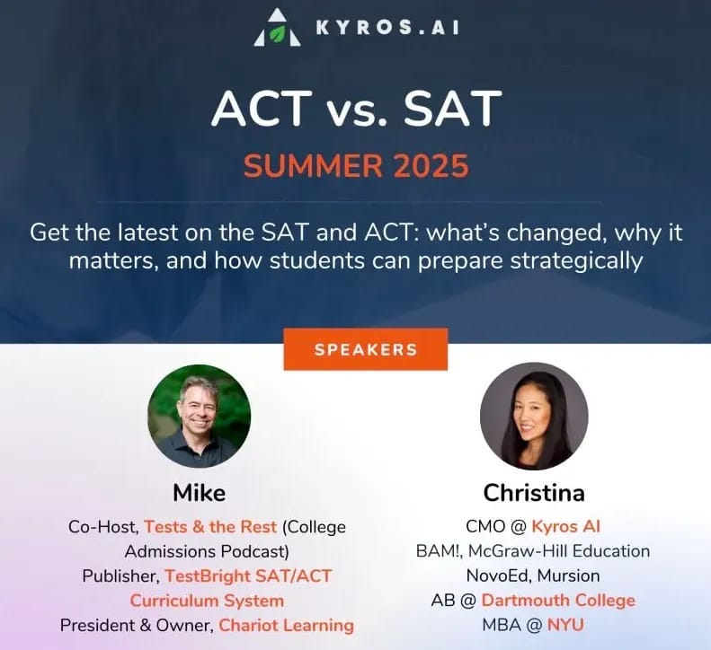 🎓 📚 🔖 What are the SAT & ACT? Why do they matter? And what can and should teens and their families do about them during this dynamic moment in college admissions history? Join Mike Bergin and Kyros AI on June 5 from 7-8pm EDT for an essential conversation about the SAT vs. ACT in Summer 2025! This expert webinar is free but registration is required. REGISTER NOW.